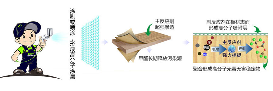 而專業(yè)除甲醛公司則不一樣,專業(yè)除甲醛公司是從甲醛的來(lái)源根本上著手治理。其去除甲醛的原理是:通過(guò)涂刷或噴涂一種高效甲醛清除材料,該材料具有高滲透性,噴涂于人造板家具板面,其主反應(yīng)劑超強(qiáng)滲透板材內(nèi)部,主動(dòng)吸附捕捉游離態(tài)甲醛分子,副反應(yīng)劑在家具表面強(qiáng)力吸附,這種吸附作用屬于氣體分子由固態(tài)→液態(tài)體系的擴(kuò)散,擴(kuò)散速度很快,是甲醛等異味分子自然釋放(固態(tài)→氣態(tài)體系的分子運(yùn)動(dòng))的數(shù)千倍,因此,往往需要自然釋放數(shù)月至一年以上的有害物質(zhì)分子釋放周期可以縮短在幾十小時(shí)內(nèi)完成,并且整個(gè)過(guò)程由于產(chǎn)品中的有效官能團(tuán)能將甲醛等有機(jī)物分子捕捉并分子交聯(lián)聚合,形成穩(wěn)定無(wú)毒無(wú)害的高分子穩(wěn)定物,因此除醛去味過(guò)程是不可逆的,從而達(dá)到凈化室內(nèi)空氣的效果。