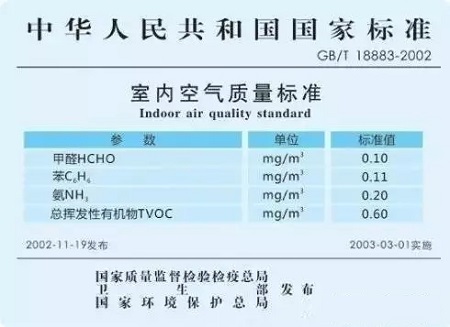 這個(gè)標(biāo)準(zhǔn)是由國家質(zhì)量監(jiān)督檢驗(yàn)檢疫總局、衛(wèi)生部、國家環(huán)保總局于2002-12-19發(fā)布,2003年3月1日實(shí)施的。在這個(gè)標(biāo)準(zhǔn)里,規(guī)定了室內(nèi)甲醛濃度安全限值不得高于0.1毫克/立方米,是推薦性標(biāo)準(zhǔn),非強(qiáng)制性標(biāo)準(zhǔn)。這個(gè)標(biāo)準(zhǔn)主要用于衡量人居室內(nèi)環(huán)境健康的依據(jù),在這個(gè)標(biāo)準(zhǔn)中不僅有甲醛、苯等裝修有害氣體,也對物理方面的溫度、濕度、PM2.5等都有規(guī)范要求,涉及到的指標(biāo)有19項(xiàng)。