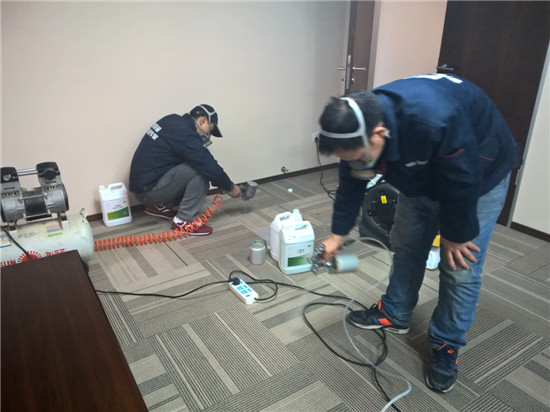 我公司施工人員對(duì)化纖地毯進(jìn)行VOC清除除異味作業(yè)