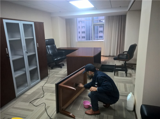 我公司施工人員對(duì)木制品家具進(jìn)行除甲醛作業(yè)